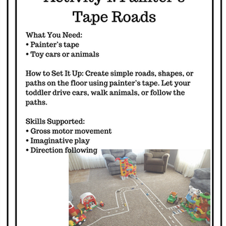 Create roads or shapes on the floor using painter’s tape. Let your toddler drive toy cars or walk animals along the paths.
